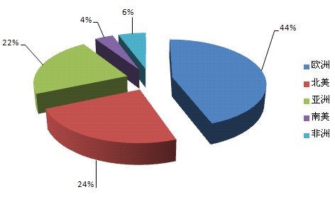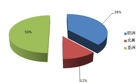 根据19号公告公布的企业看出,分别来自欧洲、北美、亚洲、非洲和南美,其中欧洲24家,北美13家,亚洲12家,非洲3家,南美2家,企业主要来自较发达国家和地区,如图一所示。