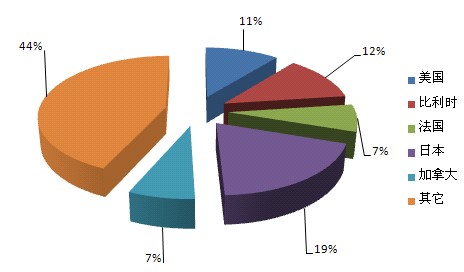 83个产品来自于20个国家和地区,前5位国家和地区分别是日本16个产品,比利时10个产品,美国9个产品,加拿大6产品、法国6个产品,占比全部产品比例近60%,如图二所示。