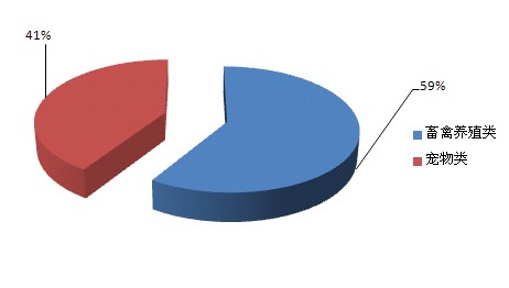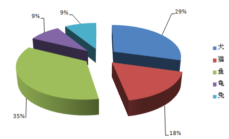 在34个宠物类获证产品中,观赏鱼类为12个产品,犬类为10个产品,猫类为6个产品,龟类为3个产品,兔类为3个产品,产品基本符合国内宠物豢养习惯和比例。如图六所示。