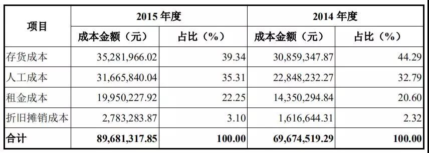 下图为瑞鹏2014-15年度公司营业成本的具体情况(之后的年度财报均未公布):