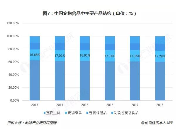 2013-2014年,国内宠物食品中,宠物零食所占的比重波动上升,从2013年的16.68%增至2018年的17.28%。主粮市场竞争激烈,而零食市场集中度低,增速迅猛,进入市场的壁垒较低。零食市场规模渐长,成为当前国产宠物食品品牌突围的关键点。