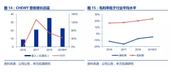 而作为鲜粮第一品牌,以及刚上市不久、美国最大的宠物电商Chewy而言,2019上半年表现亮眼,增速明显,FreshPet营收同比增长26%,Chewy同比增长44%