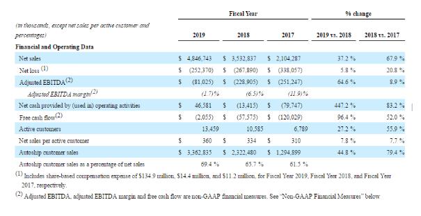 在用户数据上的表现,截至2020年2月2日,Chewy网站的活跃用户数为1350万,与上一年度的数据相比增长了27%,每个活跃客户的净购买额达到360美元,同比增长10.4%。其中,“Autoship”订阅用户为全年的销售额贡献了33.6亿美元,相比2018财年增长了37.9%,占2019财年总净销售额的69.4%。