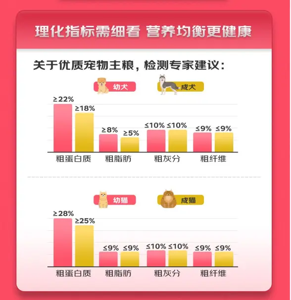 关于优质宠物主粮,欧陆检测的专家对幼犬、成犬、幼猫、成猫均给出了建议。其中,幼猫所需蛋白质最多,建议宠物主粮粗蛋白含量≥28%,而对于粗灰分和粗纤维两项,专家建议分别应低于10%和9%。