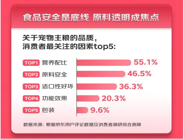 对于消费者关注的因素,根据京东用户评论数据及消费者调研综合测算,有55.1%的用户关注营养配比,46.5%的用户关注原料安全。另外,适口性好坏、功能效果、包装也是消费者关注的因素。