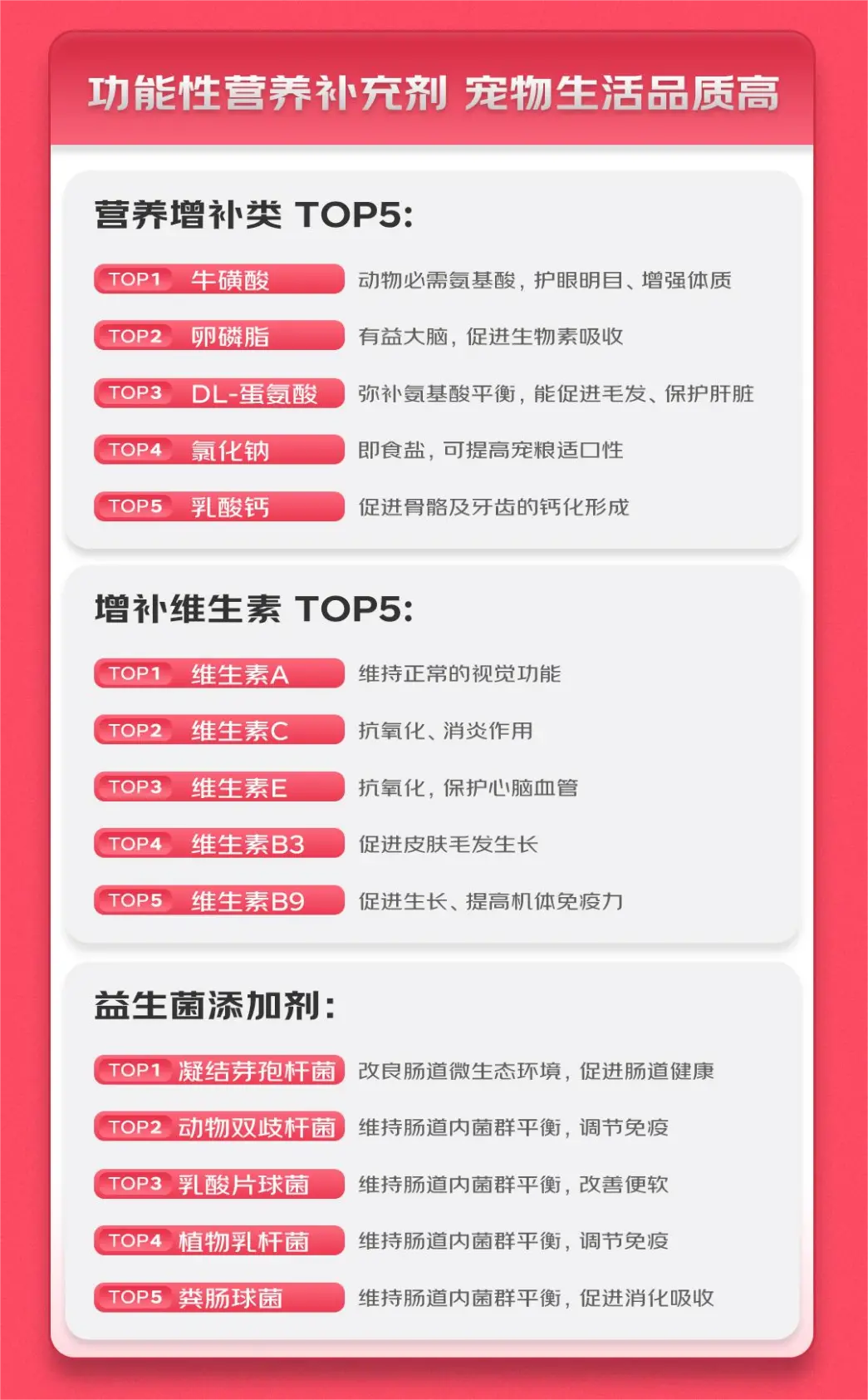 报告还为消费者科普了宠物主粮中各种功能性营养补充剂的作用,包括营养类添加剂、维生素、益生菌三类。