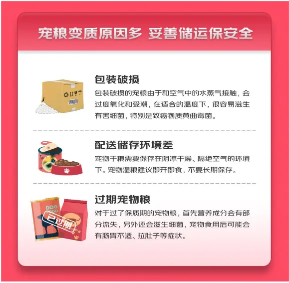 另外,在宠物主粮的储运方面,包装破损、配送储运环境差都是容易导致宠物主粮变质的原因。对于已过期的宠物主粮,专家建议尽量不要用其喂养宠物,以免宠物出现肠胃不适、拉肚子等症状。