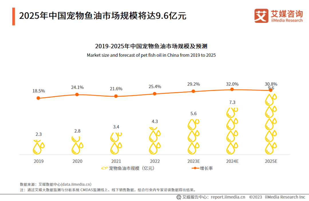 近年来养宠人群增多,对于宠物毛发养护等需求不断提升,拉动了宠物鱼油市场的增长。艾媒咨询数据显示,2022年中国宠物鱼油市场规模为4.3亿元,预计2025年该市场规模将跃升至9.6亿元,市场成长性强。研究还发现,胶囊型宠物鱼油市场发展尤为迅速。宠物鱼油胶囊产品具备便携、存储方便、用量可控等特点,满足了宠主喂食多样需求,受到消费者的青睐。