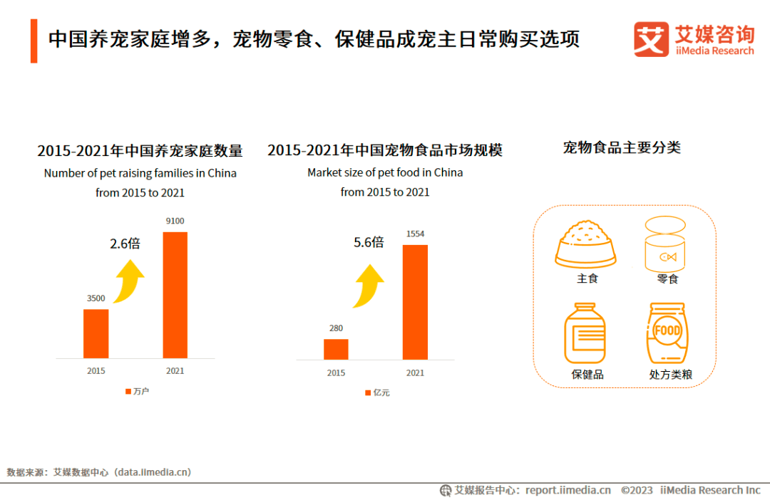 数据显示,2015年至2021年,中国养宠家庭数量上升了2.6倍,宠物食品市场规模上涨5.6倍。艾媒咨询分析师认为,中国居民消费水平上升,对于宠物食品消费理念从“吃饱”转变到“吃好”,宠物行业越发多元化发展,宠物零食、保健品也逐渐成为宠主购买宠物食品的日常选项。