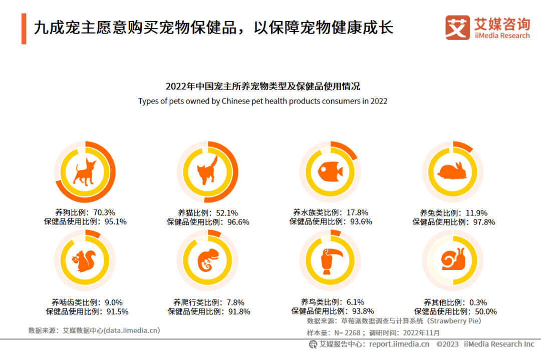 调研数据显示,养狗(70.3%)、猫(52.1%)类人群最多;宠主对于宠物保健品的需求普遍较高,常见类型宠物使用保健品比例均达90.0%以上。艾媒咨询分析师认为,宠主愿意花费更大的成本去保障宠物健康成长,宠物保健品行业整体态势向好。