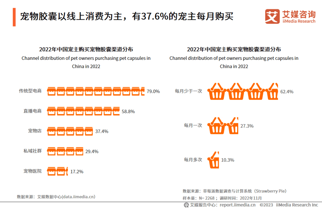 数据显示,宠物胶囊宠主主要通过线上传统电商(79.0%)、直播电商渠道为主(58.8%);每月购买的宠主占到37.6%,每月多次购买的宠主占到10.3%。