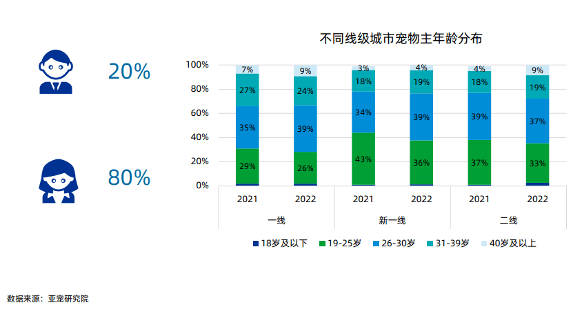 随着社交网络等数字技术的崛起,线上线下融合等新商业模式涌现,消费主体、消费偏好、消费形态也经历了一场迭代进化,作为消费新生力量的90后、00后崛起,跃上了消费的潮头浪尖。根据2022年调研数据显示,目前二线及以上城市的主要养宠人群仍以19-30岁的青年人为主占比68%,其中女性占比80%。