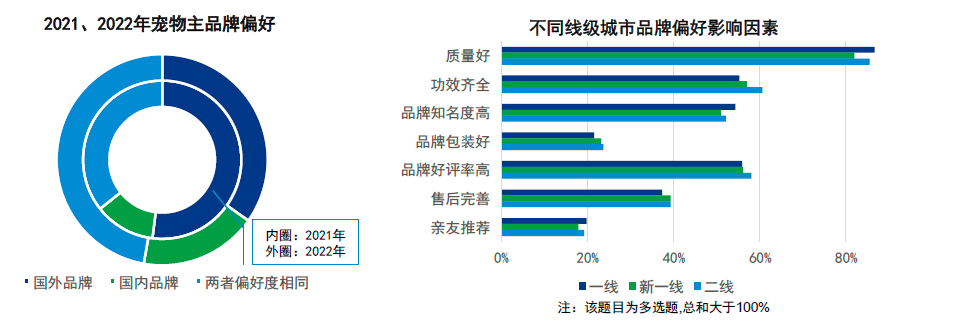 对比2021年一半以上宠物主偏好国外品牌,2022年仅35%宠物主表示会优先购买国外品牌,本土品牌崛起并逐渐受到更多消费者认可;