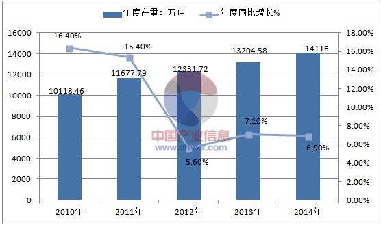 2014年全年,我国小麦粉产量为14116万吨,同比增长4.76%。