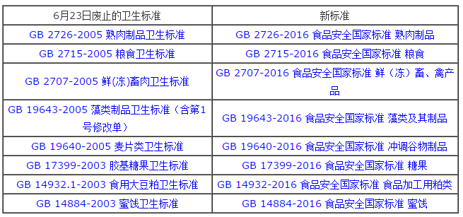 国家对这8项标准的名称均做了修改,去掉原来的“卫生标准”,改为“食品安全国家标准 xx ”,熟肉制品标准修改了范围、术语和定义、理化指标及微生物指标;粮食标准修改了术语和定义、感官要求、有毒有害菌类、植物种子指标、理化指标、贮存及运输要求及附录,鲜(冻)畜、禽产品增加了术语和定义,修改了原料要求、感官要求及理化指标; 藻类及其制品修改了范围、感官指标、理化指标、微生物指标并增加了术语和定义;冲调谷物制品修改了范围、术语和定义、理化指标及微生物指标;糖果标准修改了范围修改了感官要求、理化指标、微生物指标,增加了术语和定义、食品营养强化剂的使用要求。食品加工用粕类标准修改了范围、感官指标、理化指标、标识的要求,增加了术语和定义;蜜饯标准修改了范围、修改了术语和定义、原料要求、感官要求、理化指标及微生物指标。