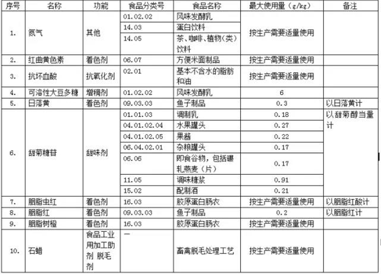 拟征求意见的食品添加剂名单内包括氮气、红曲黄色素、抗坏血酸、可溶性大豆多糖、日落黄、甜菊糖苷、胭脂虫红、胭脂红、胭脂树橙、石蜡等共10项内容,均已作为食品添加剂已列入《食品安全国家标准 食品添加剂使用标准》(GB 2760)。在《征求意见中》,上述品类的使用范围有所扩大,涉及风味发酵乳、罐头、方面米面等食品。