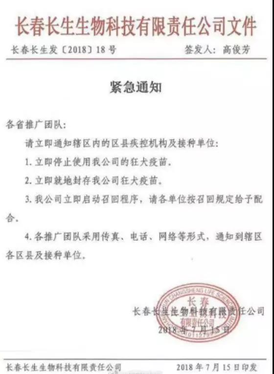 随后,长生生物发布紧急通知,要求各地立即停止使用公司狂犬疫苗,就地封存该公司狂犬疫苗,并启动召回程序。