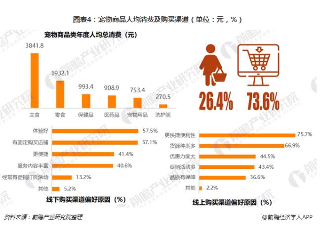 ——宠物食品类线上销售渠道仍然是大势所趋 在宠物消费中,商品类与服务类消费的比例接近7:3。宠物商品包括主食、零食、宠物保健品、医药品、宠物用品和洗护类商品。宠物商品类中,主食类年度人均消费最高,为3841.8元;零食类年度人均消费排名第二,年度人均消费为1932.1元。