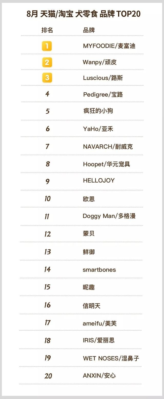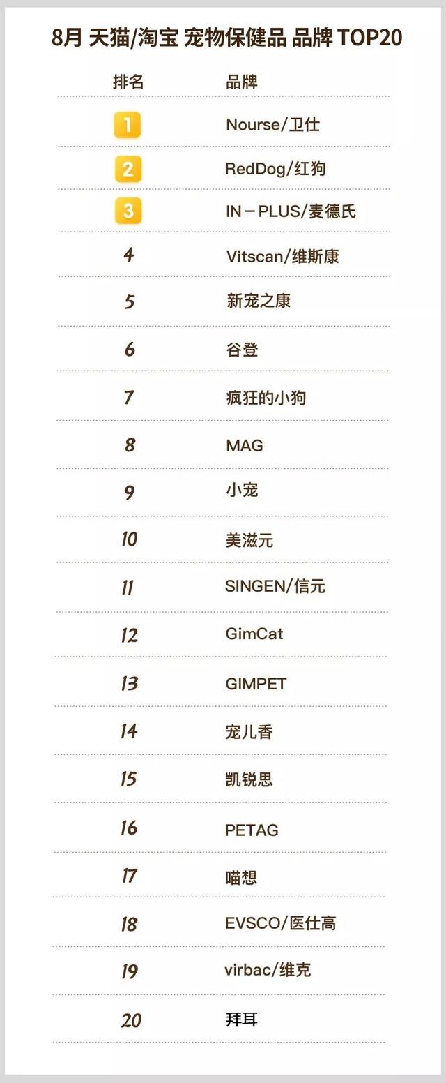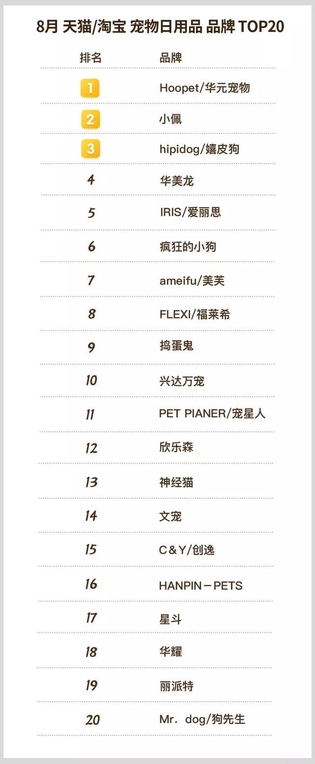 接下来具体看看8月份的天猫/淘宝【宠物食品、用品】领域TOP20榜单的上榜情况。