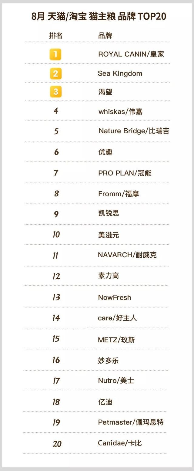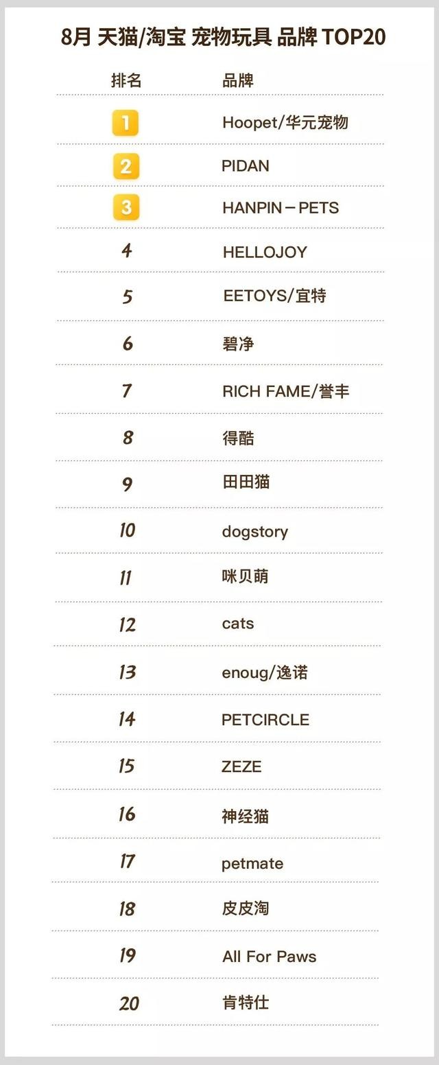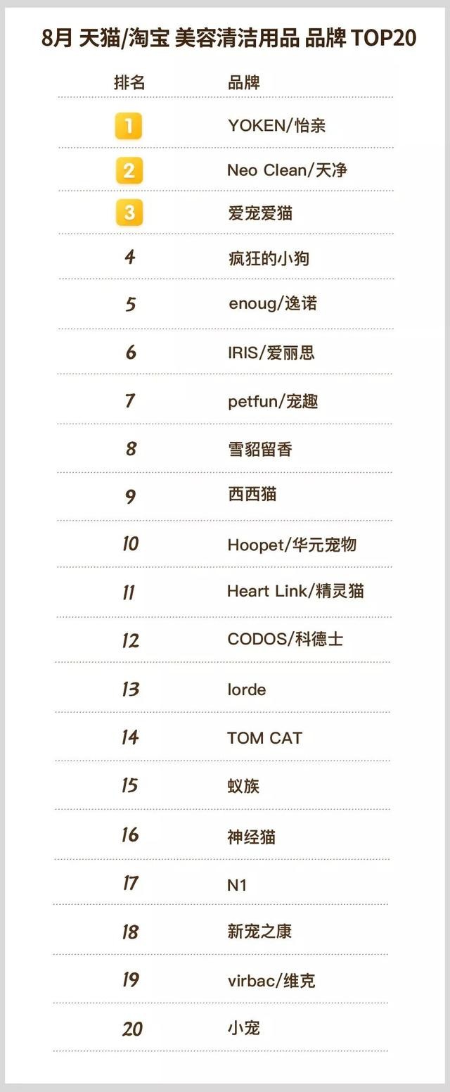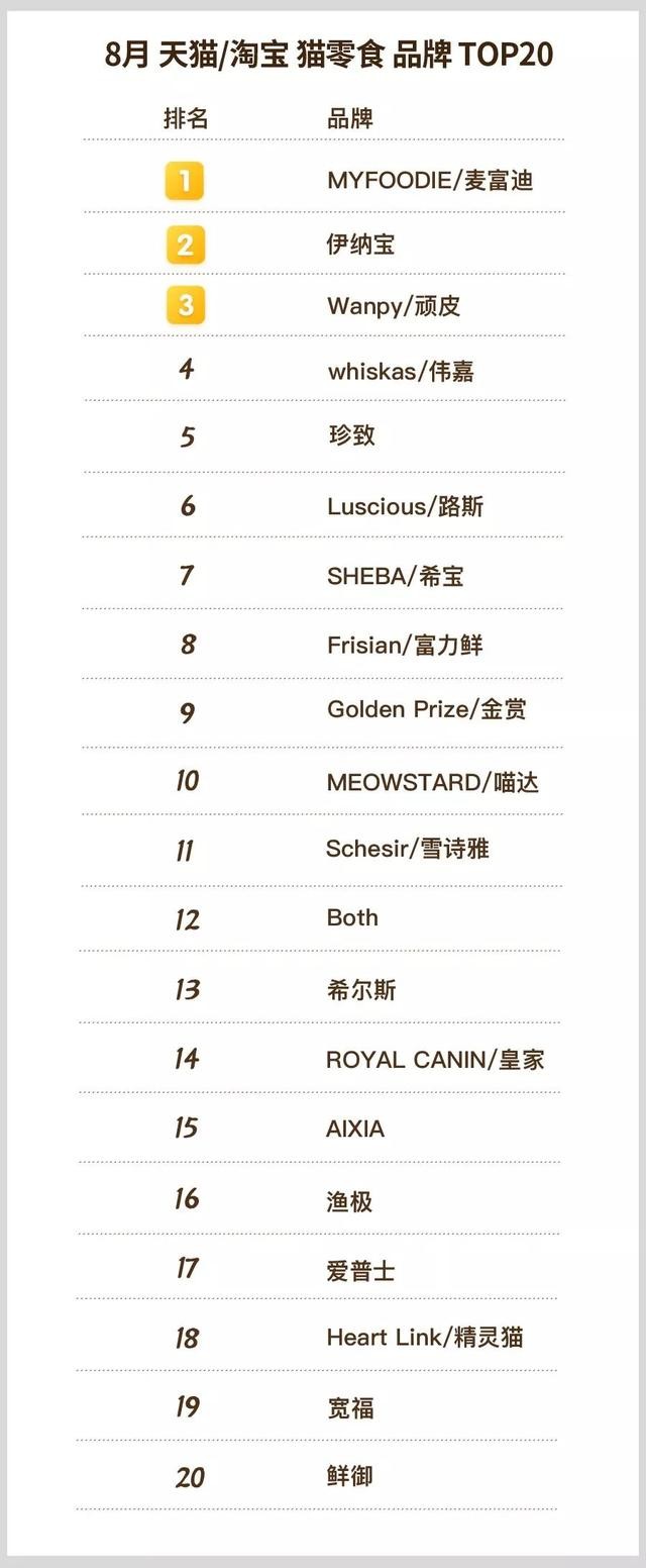 接下来具体看看8月份的天猫/淘宝【宠物食品、用品】领域TOP20榜单的上榜情况。