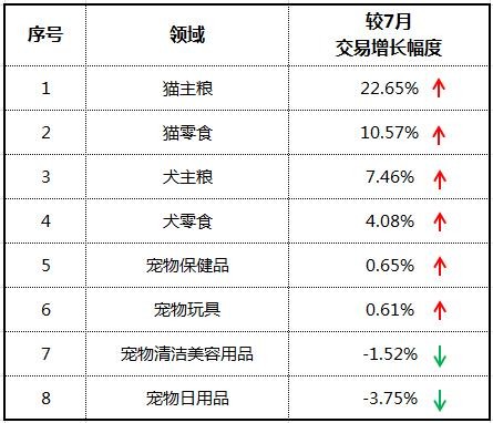 从交易增长幅度上来看,猫主粮增幅最高,较7月增长22.65%;猫零食紧随其后,增长10.57%;接下来是犬主粮增长7.46%,犬零食增长4.08%。宠物食品成为整个行业增幅最高的领域,且猫食品的增幅翻倍超过犬食品,由此可见养猫人群正在飞速增加。