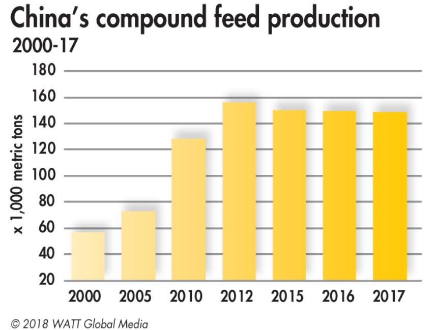 中国是世界第二大复合饲料生产国,也是最大的猪肉生产国和消费国。猪肉行业增长近9%。中国也是世界上最大的水产养殖生产国,2017年增长4.5%。然而,由于高致病性禽流感(HPAI),鸡肉产量下降了6%。此外,与2016年相比,中国的复合饲料产量下降了0.5%。