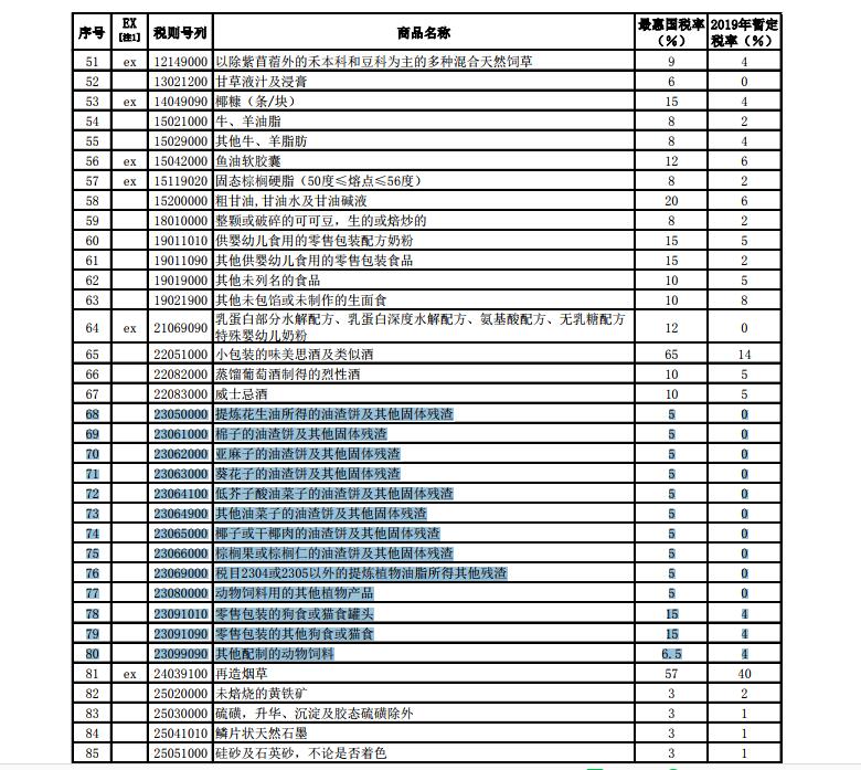 1. 根据我国与有关国家或地区签署的贸易或关税优惠协定,除此前已报经国务院批准的协定税率降税方案继续实施外,自2019年1月1日起,对我与新西兰、秘鲁、哥斯达黎加、瑞士、冰岛、韩国、澳大利亚、格鲁吉亚以及亚太贸易协定国家的协定税率进一步降低。根据内地与香港、澳门《关于建立更紧密经贸关系的安排》货物贸易协议(以下简称《协议》),自《协议》实施之日起,除内地在有关国际协议中作出特殊承诺的产品外,对原产于香港、澳门的产品全面实施零关税(见附5)。