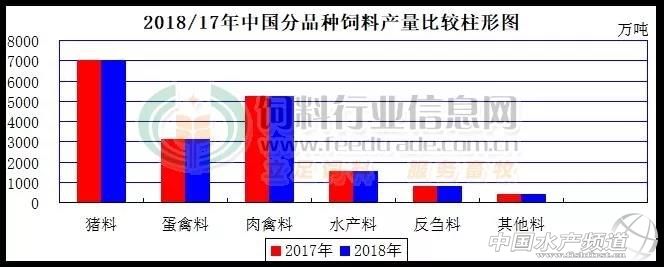 根据中国饲料行业信息网的初统数据显示:2018年中国成品饲料年度总产量18131.58万吨,同比增长0.31%。其中猪料产量7036.38万吨,同比增长0.32%;蛋禽料产量3133.06万吨,同比增长0.81%;肉禽料产量5210.09万吨,同比下降0.26%;水产料产量1549.08万吨,同比增长0.98%;反刍料产量800.60万吨,同比增长1.11%。其他料产量402.38万吨,同比下降0.32%。猪料、蛋禽料及水产料、反刍料总产量同比增长,肉禽料及其他特种动物饲料产量同比下降。