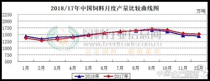图2:2018年/17年中国饲料月度产量分布比较(单位:万吨)