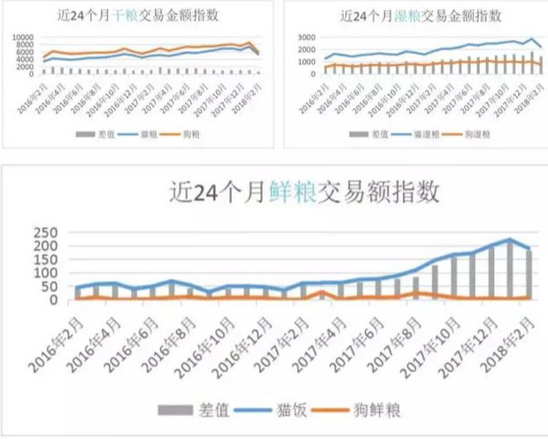 老齐统计了淘宝交易指数发现,从2016年2月-2018年2月宠物猫狗在干粮、湿粮、鲜粮三大市场上的交易金额指数(下图)发现: