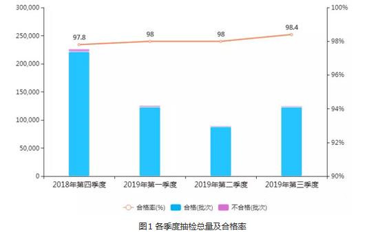 2019年7月至9月,国家及地方(省、自治区、直辖市)市场监管部门共在全国范围内抽检食品及食品相关产品125039批次,其中合格123051批次,不合格1988批次,合格率为98.4%,与第二季度相比抽检量增加35290批次,合格率提高0.4%。各季度抽检总量及合格率见图1: