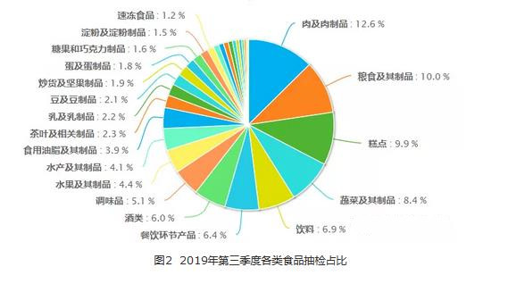 抽检的各食品类别中,肉及肉制品、粮食及其制品、糕点、蔬菜及其制品、饮料抽检比重较大。2019年第三季度各类食品抽检占比见图2(抽检占比不足1.0%的未予显示):
