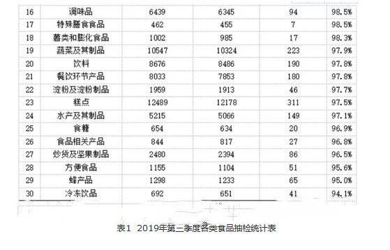 从抽检合格率上来看,食品添加剂、可可及焙烤咖啡产品、粮食及其制品、豆及豆制品、速冻食品、乳及乳制品抽检合格率较高,均在99.5%以上。方便食品、蜂产品和冷冻饮品抽检合格率偏低,在96.5%以下。2019年第三季度各类食品抽检量及抽检合格率统计见表1