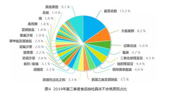 其中菌落总数超标、大肠菌群超标、过氧化值超标、霉菌超标和二氧化硫残留量超标等问题比较突出,具体不合格原因占比见图4: