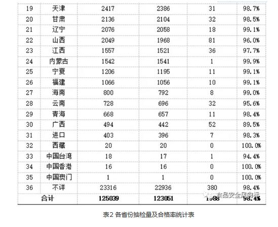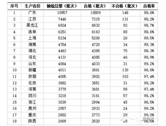 抽检的食品产地覆盖了全国 31 个省、自治区、直辖市,以及港澳台地区。基于产品品类及产业分布特点,各地区抽检数量差异较大,抽检产品数量较多的是华北、华东、华中、东北地区。从行政区域来看,广东省抽检数量最多,占总抽检量的 8.8%,其次是江苏(6.0%)、黑龙江(5.5%)、吉林(5.0%)、上海 (4.2%)等省市。各省份抽检量及合格率统计表见下表(按抽检量由高到低):
