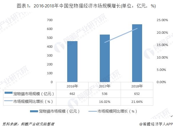 2016-2018年以来,中国宠物猫市场规模呈现出高速增长,2018年中国宠物猫市场规模高达652亿元,同比增长21.64%。