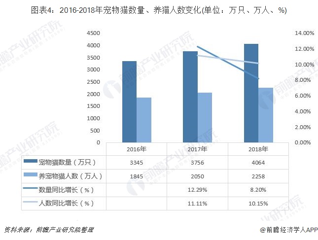 2016-2018年,我国宠物猫数量、养猫人数持续上升,均保持着10%左右的增长势头,到2018年,宠物猫数量达到4064万只,养猫人数为2258万人。