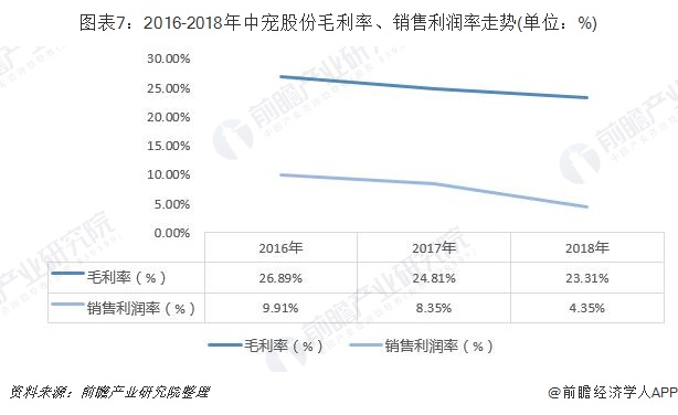而这一模式,也进一步影响到了我国宠物食品类的盈利情况。以中宠股份数据为例。2016-2018年,中宠股份毛利率、销售利润率均呈现出下降的趋势。特别是净利率,2018年中宠股份销售净利率为4.35%,较2016年下降5.56个百分点。