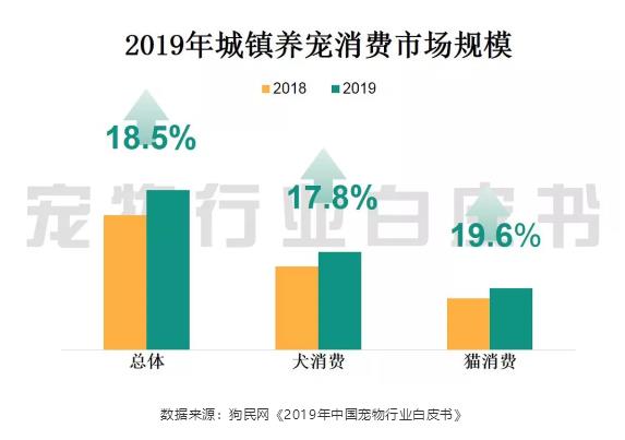据《2019年中国宠物行业白皮书》(消费报告)显示,2019年中国城镇宠物(犬猫)消费市场突破2000亿的关卡,整体消费规模达到2024亿元,比2018年增长18.5%。