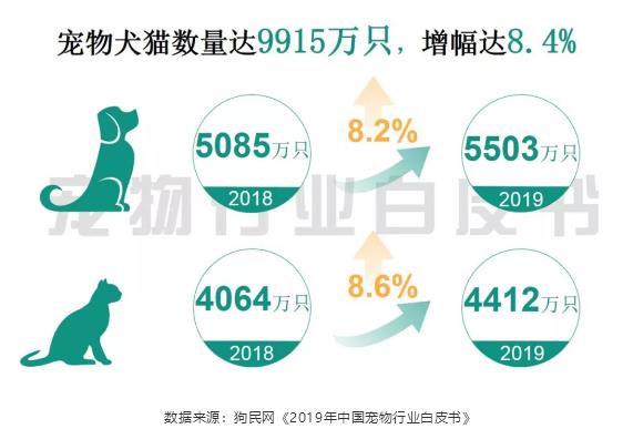 养宠数量方面,2019年全国城镇宠物犬猫数量达到9915万只,比2018年增长766万只。其中宠物犬数量为5503万只,比2018年增长8.2%;宠物猫数量为4412万只,比2018年增长8.6%,宠物猫数量增幅超过宠物犬的增幅。