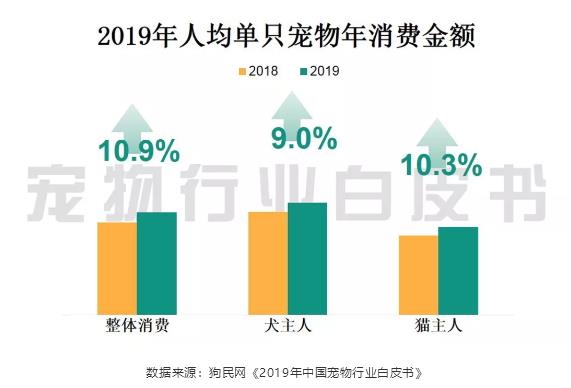 与去年相比,2019年单只宠物年消费金额达到5561元,同比增长545元,增幅10.9%。