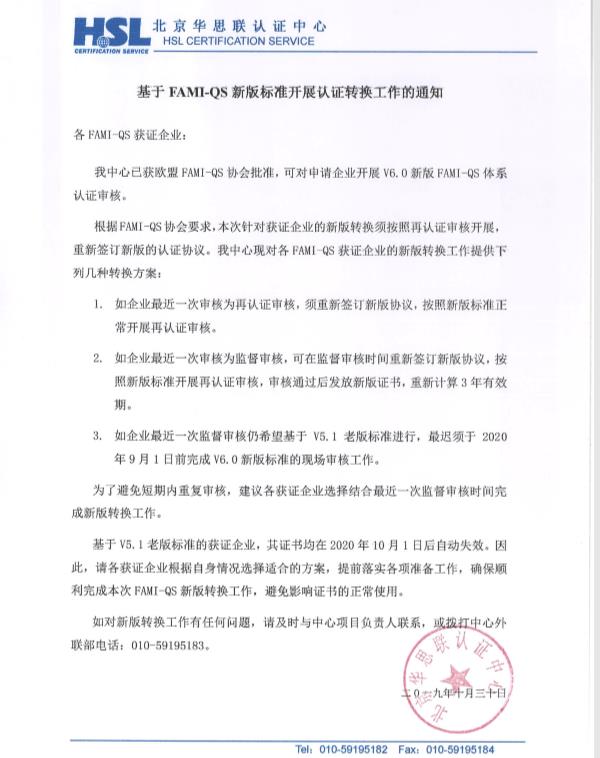 基于FAMI-QS新版标准开展认证转换工作的通知