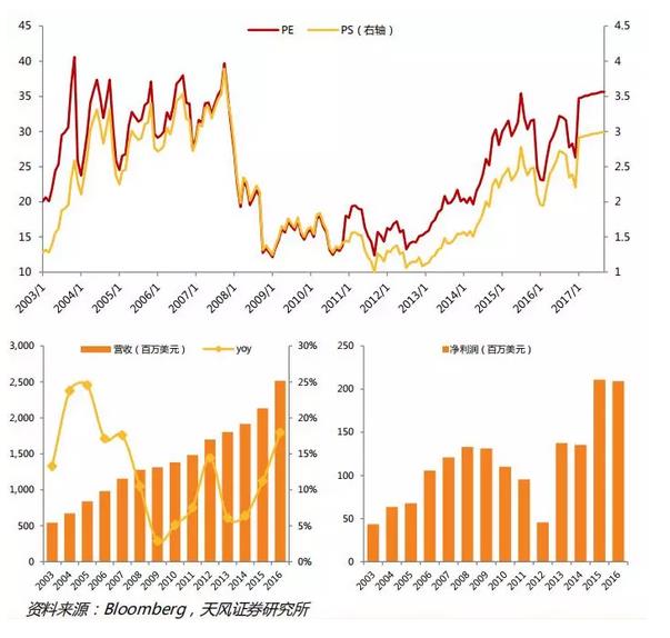2003-2008年公司营收复合增速18.6%,净利润复合增速25.1%,这期间公司整体估值在25-40倍波动。金融危机时下降至12倍。2014-2016年公司营收以及净利润复合增速9.5%/15.6%,估值也持续提升到35倍。