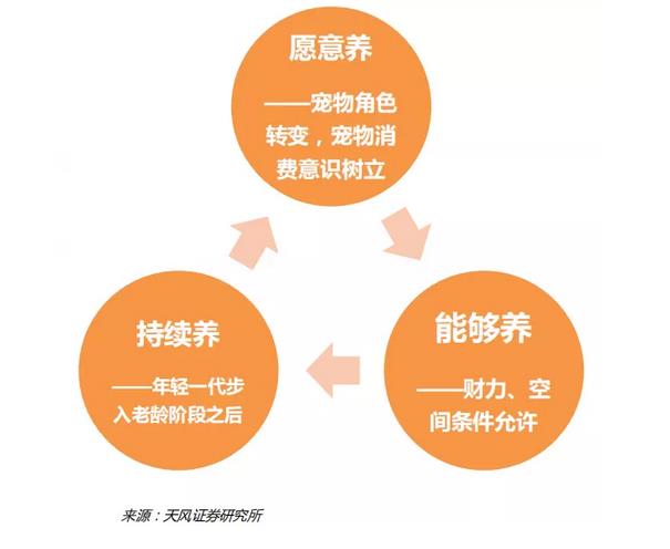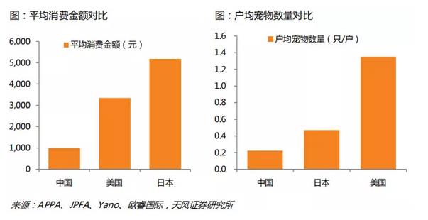 天风证券提出,市场规模=家庭数量x户均宠物数量x单只消费金额。其分析,美国每户家庭约有超过1只宠物,日本户均有约0.5只宠物。导致一差异的原因就是住房条件,住房面积越大,越倾向于养宠甚至多养宠物。美国单只宠物年消费约3300元,而日本则超过5000元。