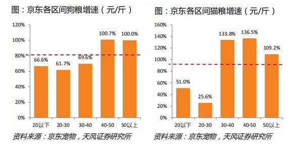 当宠物行业进入成熟期后,高端化就将成为趋势。以京东平台为例,狗粮及猫粮的平均增速为79.70%、90.14%。