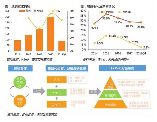 天风证券分析,2017年瑞鹏股份营收2.97亿元,同比增长55.9%。营收占比中,医疗保健占比65%,美容占比17%,食品销售16%。由于公司快速扩张,导致毛利率净利率持续下滑。