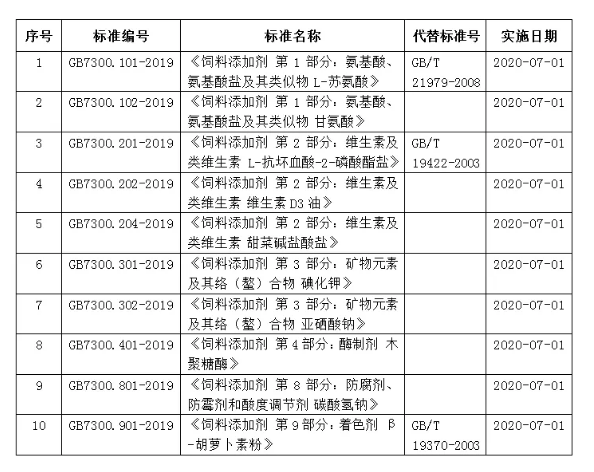 根据中华人民共和国国家标准2019年第15号公告,2019年12月17日国家市场监督管理总局(国家标准化管理委员会)批准发布十项饲料添加剂国家标准,具体标准如下: