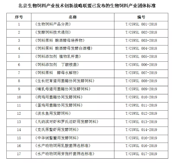 截止2019年底,国内已有2840家社会团体在全国团体标准信息平台注册,覆盖全国30个省、市、自治区,共发布11285项团体标准,其中农林牧渔相关领域共发布1345项。生物饲料开发国家工程研究中心委托北京生物饲料产业技术创新战略联盟,联合联盟会员单位起草、制定、发布17项生物饲料产业团体标准,涉及生物饲料产品分类、发酵饲料技术通则、植物乳杆菌、丁酸梭菌、酵母培养物、畜禽用发酵饲料、水产用发酵饲料等,详见下表: