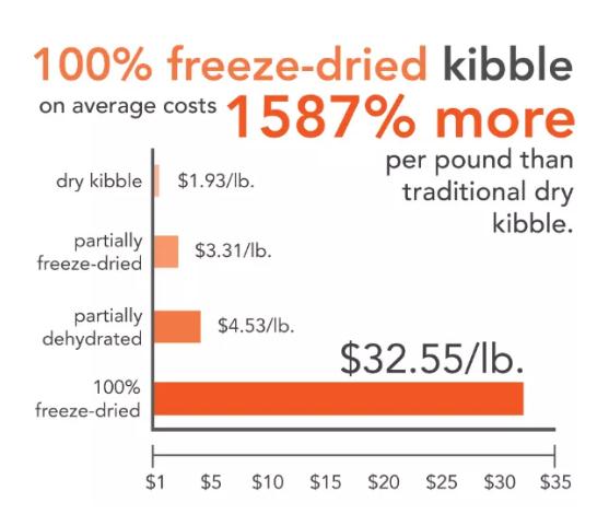 根据《Package Facts》的数据,采用100%冻干的宠物食品平均价格比传统膨化粮高1,587%,其中,采用100%冻干的宠物食品平均成本为每磅32.55美元,而膨化粮平均为每磅1.93美元。