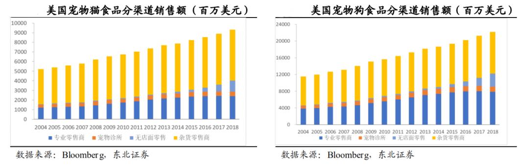 相较于成熟的美国养宠市场,我国的宠物产业落后世界领先水平20-30年,宠物食品的市场规模还不足美国的十分之一。我国单只宠物消费不足、人均宠物拥有数量少导致我国宠物消费在地理位置上呈现出分散化的特征,线下单一的小规模宠物店得不到很好的消费支撑。此外,商超零售渠道受到了入驻费、品牌知名度的限制,同时还有快速发展的电商渠道的挤压,本土品牌也受到打压。